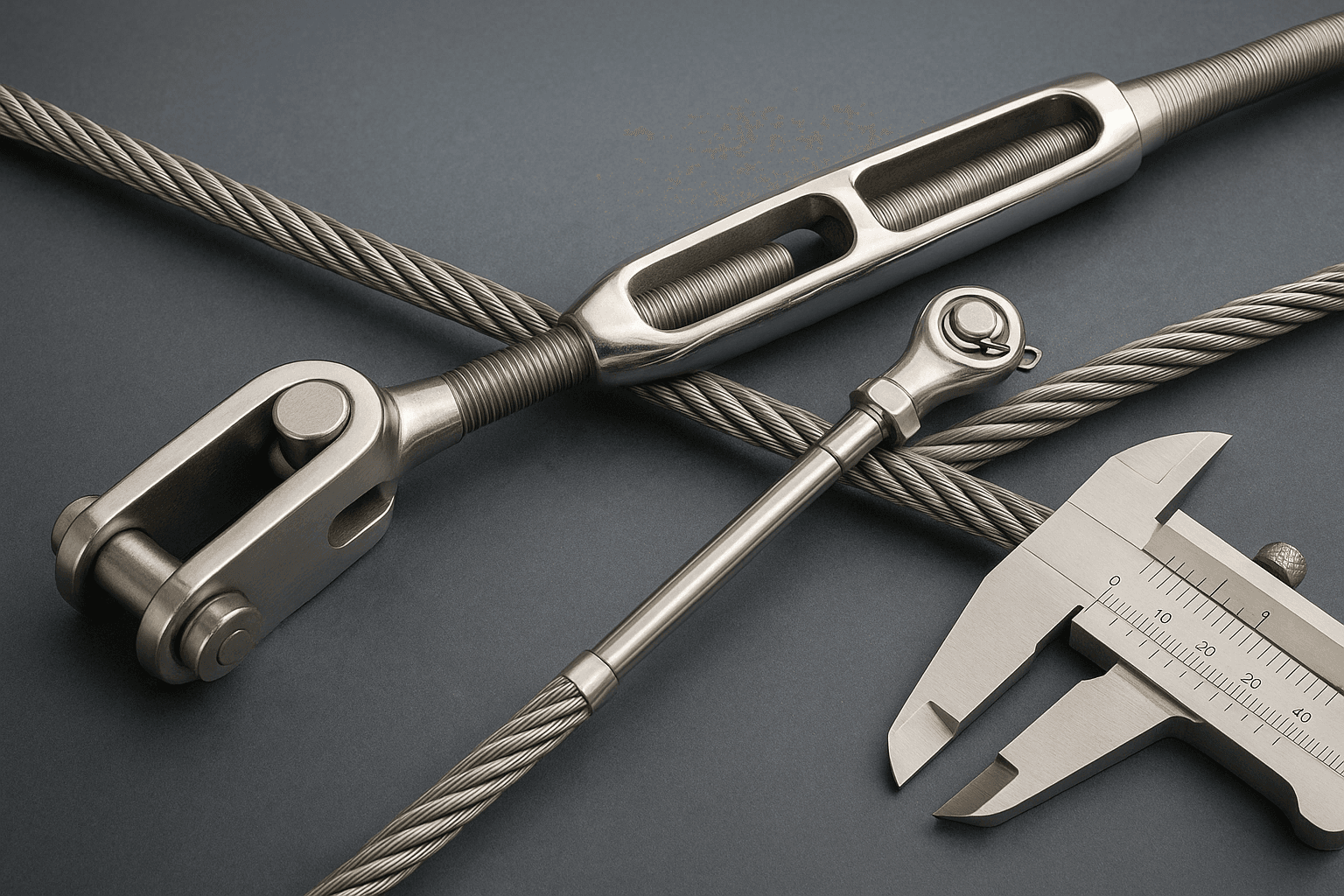 A partir de Ø 4 mm, es obligatorio el uso de terminales de acero inoxidable prensados hidráulicamente (por ejemplo, con maquinaria Wireteknik).