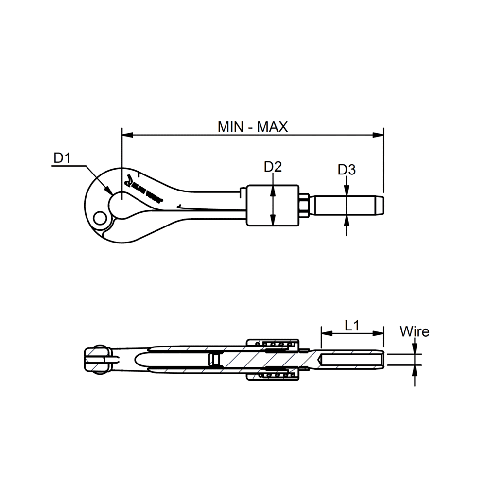 | ART. NO. | WIRE | THREAD | D1 (mm) | D2 (mm) | D3 (mm) | L1 (mm) | MIN – MAX (mm) | KG/100 |