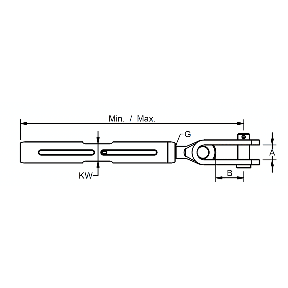 | ART. NO. | G (inch) | PIN (mm) | A (mm) | B (mm) | MIN – MAX (mm) | KW (mm) | BL / KG | KG / 100 |